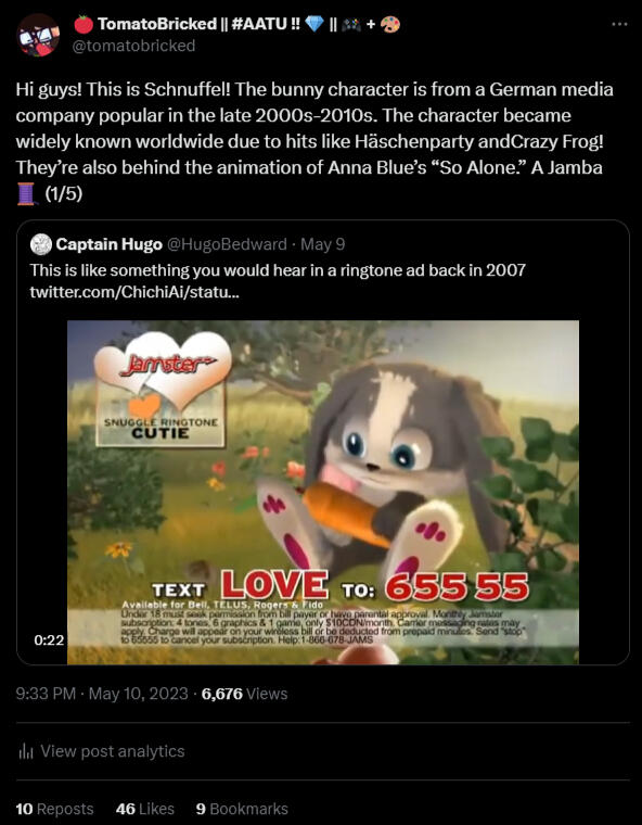 This Carrd is made to archive as much official Schnuffel Bunny and his girlfriend, Schnuffelienchen art as possible for historic and nostalgic preservation. The continuing writing is taken from the Schnuffel Wikipedia page. Sadly I cannot archive every song or every piece in existence, however if you find anything of interest and/or needing addition, please reach out to my Twitter at @TomatoBricked."The first concepts of the Schnuffel character were born on July 2. The original ringtone was turned into a song by Sebastian Nussbaum and Andreas Wendorf and recorded under the title Kuschel Song ("Cuddling song"). The German singing voice of Schnuffel is unknown, although it is known that they were an employee of Jamster. The single was released in February 2008 and quickly topped the German and European charts. After the song went to the top of the Austrian charts and to number 2 in Switzerland, plans were made to release the song internationally. Songs were translated in 13 languages and 13 albums have since been released, including German re-editions and international albums.Since the creation of Schnuffel, several apps have been created featuring the character, including a "virtual pet" and an educational game.Schnuffel's female counterpart and girlfriend is named Schnuffelienchen, known in English as Snuggelina. Like Schnuffel, she is a lop rabbit. Schnuffelienchen's first CD-single, "Küss mich, halt mich, lieb mich" (Kiss me, hold me, love me) was released on October 29, 2010 and stayed 1 week at the 99th position of the German charts. Her second single, "Schmetterling" (Butterfly) was released on February 28, 2012 only on the Jamba/Jamster sites, and released digitally on Amazon, iTunes and Google Play only on July 25, 2014, together with the English version.Schnuffelienchen's third single "Ohne Dich" (Without You) was released on September 26, 2014 as a digital download."